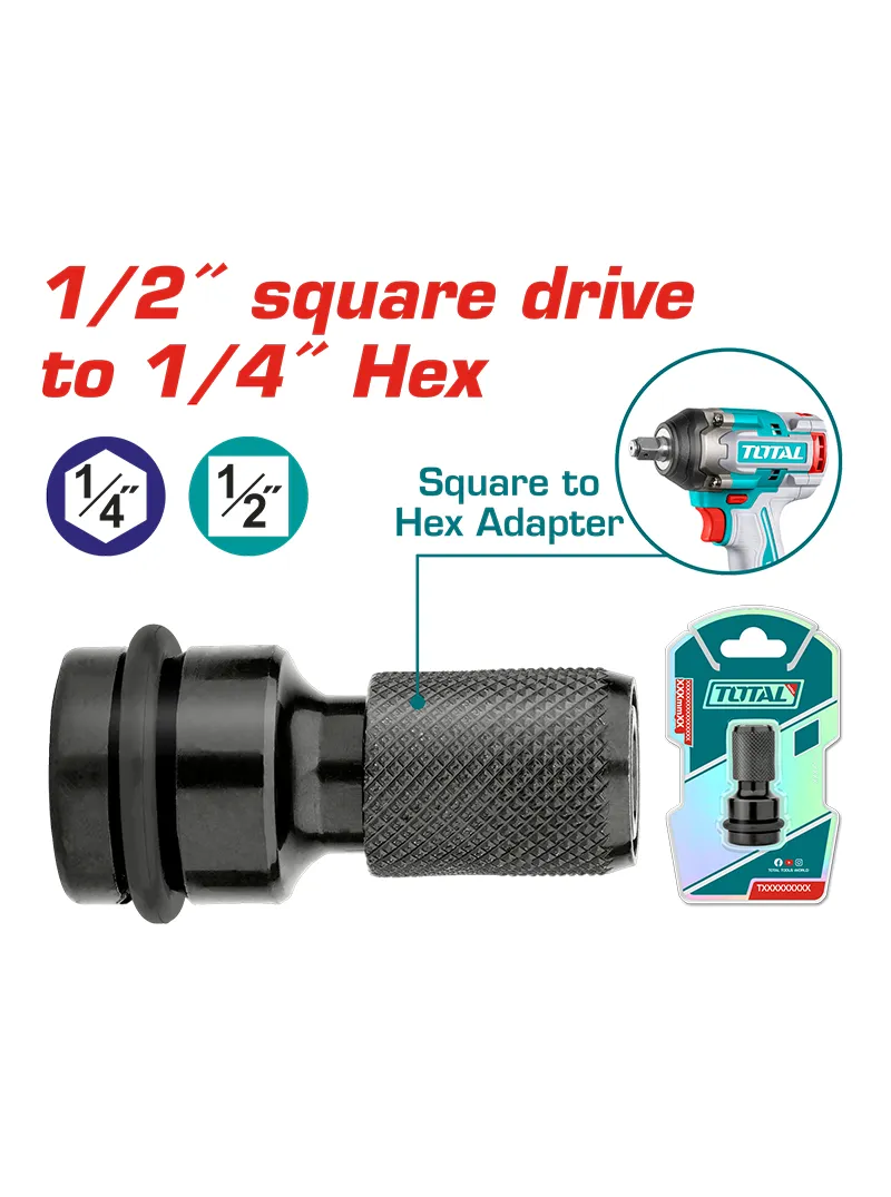 El adaptador porta puntas TOTAL TAC60501 convierte una llave de impacto con encastre cuadrado de 1/2” en un destornillador de impacto compatible con puntas hexagonales de 1/4”, gracias a su vástago cuadrado de 1/2” y encastre hexagonal de 1/4”; cuenta con una longitud total de 2” (50 mm), ideal para ampliar la versatilidad de la herramienta en trabajos de impacto, y se presenta empacado en blíster doble.