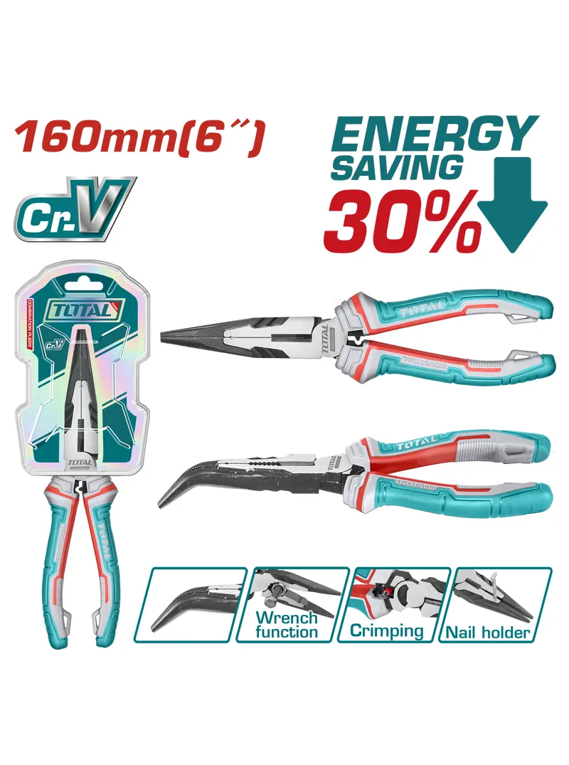 El Alicate Pinza de Punta Curva Industrial 6″ TOTAL THT24616S es una herramienta de 160 mm (6″) fabricada en acero Cr-V, con acabado negro y pulido para mayor resistencia. Su diseño ofrece 30% de ahorro de esfuerzo frente a alicates convencionales e incorpora mango TPR tricolor para un agarre firme y cómodo. Incluye funciones adicionales como engaste, sostenedor de clavos y llave inglesa, ideal para trabajos profesionales y de mantenimiento.