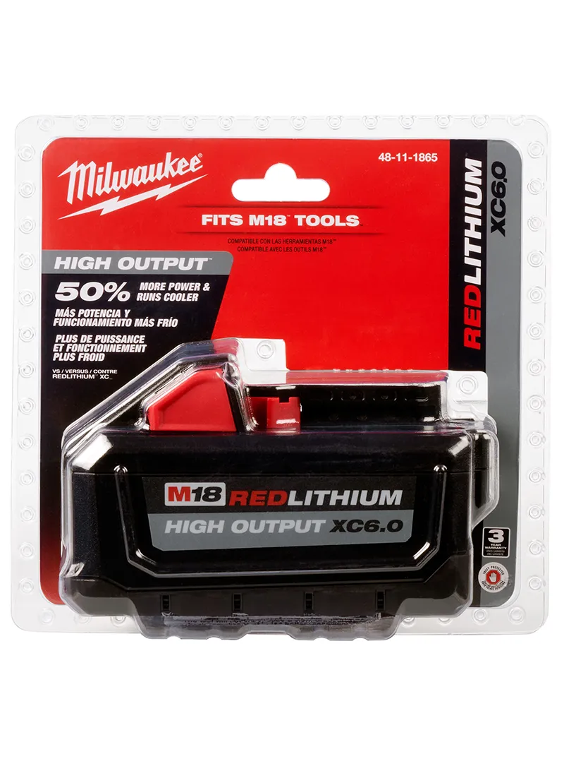 La batería ion-litio 18V 6.0Ah Milwaukee M18™ REDLITHIUM™ HIGH OUTPUT™ XC6.0 (48-11-1865) ofrece 50 % más de potencia y funciona 50 % más fría que las versiones XC estándar, garantizando mayor rendimiento en aplicaciones intensas. Su diseño optimizado combina más capacidad con un tamaño práctico, brindando autonomía extendida y potencia constante incluso en frío extremo (-18 °C). Compatible con más de 150 herramientas del sistema M18™, permite reemplazar equipos con cable y mantener la productividad en condiciones exigentes.