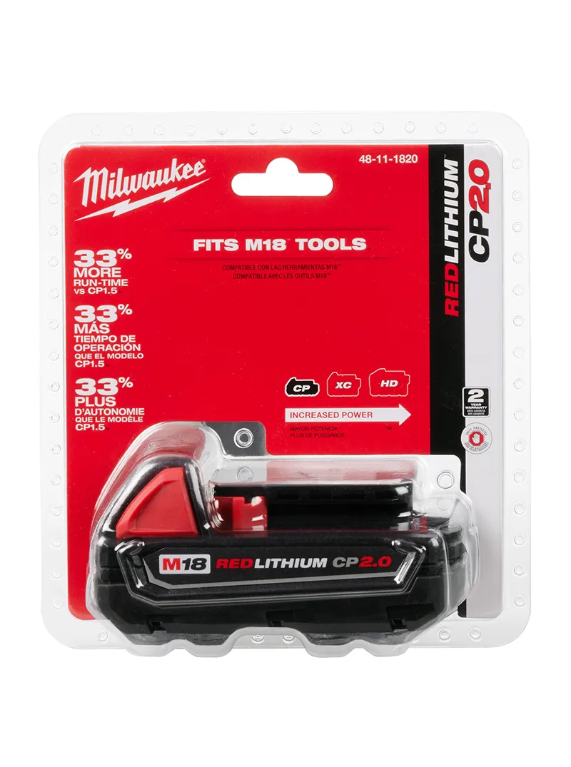 La batería compacta de ion-litio 18V CP2.0 Milwaukee 48-11-1820 ofrece 2.0 Ah de capacidad, brindando hasta 2 veces más tiempo de operación, 20 % más potencia y el doble de vida útil que las baterías estándar. Su diseño compacto y liviano reduce la fatiga y facilita el trabajo en espacios estrechos. Gracias al sistema REDLINK™, cuenta con protección contra sobrecarga, descarga y sobrecalentamiento, mientras que la gestión de celdas asegura un rendimiento constante y mayor durabilidad. Funciona incluso en temperaturas bajo 0 °F (-18 °C) y es totalmente compatible con todas las herramientas inalámbricas M18™.