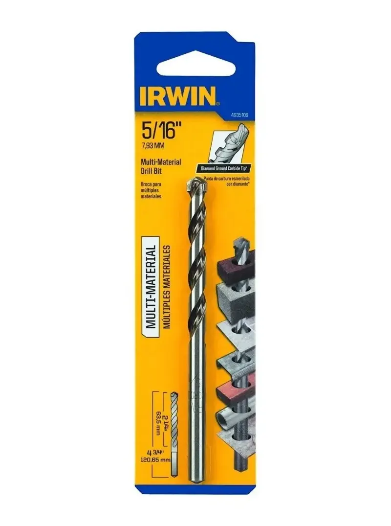 La broca tungsteno multimaterial 5/16" IRWIN 4935109 cuenta con punta de carburo con afilado de cuatro caras producido con diamante que ofrece excelente arranque y alta calidad de perforación, además de canales dobles que garantizan rápida evacuación del polvo y evitan obstrucciones, siendo ideal para trabajar en ladrillo, bloque, azulejo, metal, madera, plástico y mármol con precisión y eficiencia.