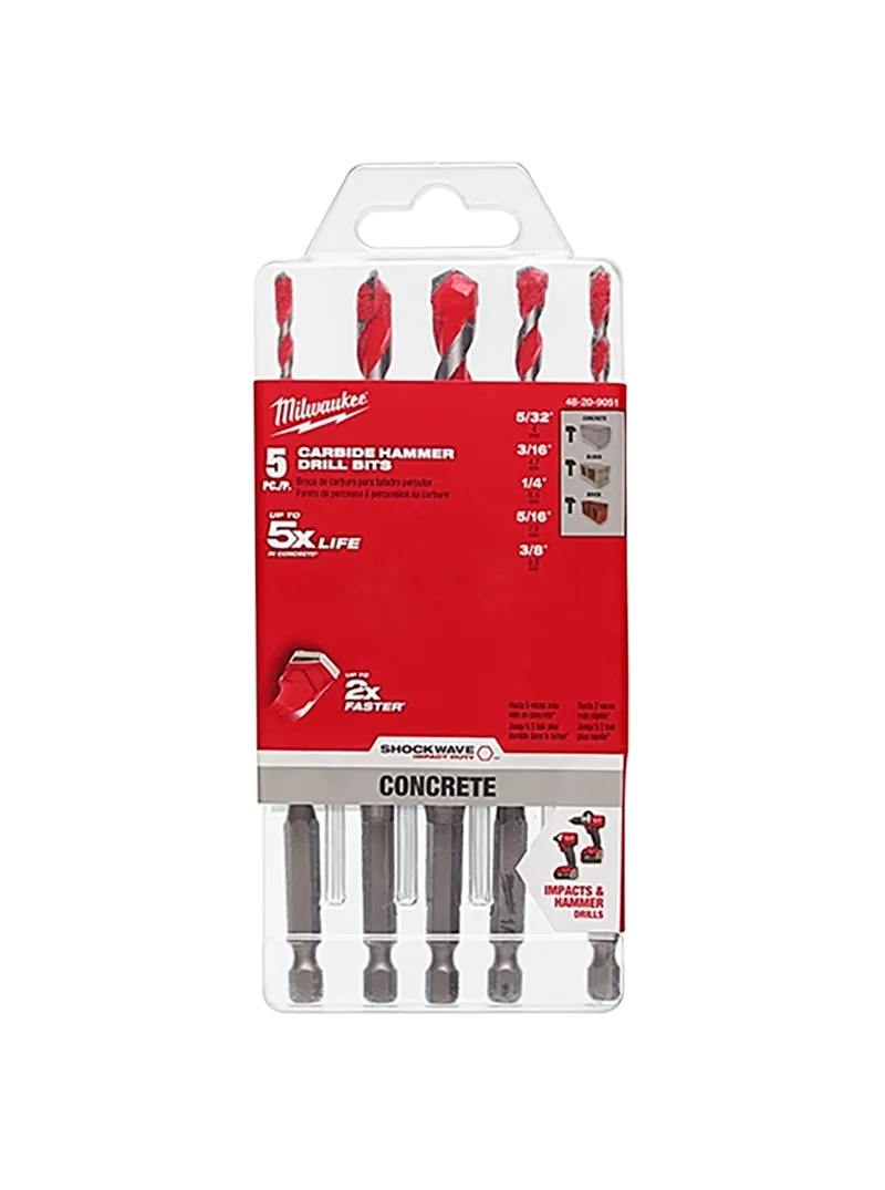 El set de brocas de tungsteno 5/32" a 3/8" 5 piezas hexagonal Milwaukee 48-20-9051 está diseñado para taladros percutores y destornilladores de impacto, ofreciendo hasta 5 veces más vida útil y perforación hasta 2 veces más rápida en hormigón y mampostería. Su punta de precisión permite arranques exactos y menor desplazamiento, mientras que las ranuras anchas eliminan el polvo y reducen el calor. Equipadas con vástago hexagonal de ¼", estas brocas son ideales para hormigón, ladrillo y bloques, disponibles en tamaños de hasta 1/2".
