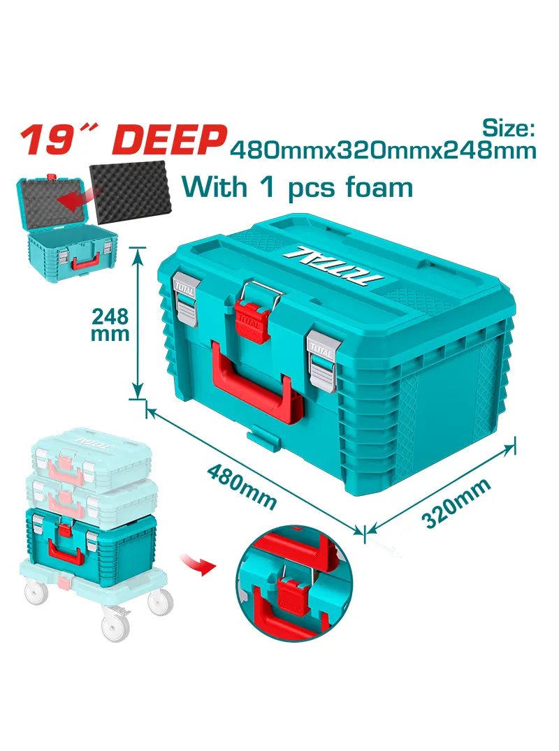 La Caja de Herramientas Plástica Apilable 19″ x 13″ x 10″ TOTAL TPBXS103 cuenta con dimensiones de 480 x 320 x 248 mm (19″ x 12.5″ x 10″) y diseño profundo para mayor capacidad. Está fabricada en plástico PP resistente, con hebillas de cierre en PP, peso de 2200 g y capacidad de carga máxima de 25 kg. Su estructura apilable permite organizar, mover y proteger herramientas de forma práctica y segura.