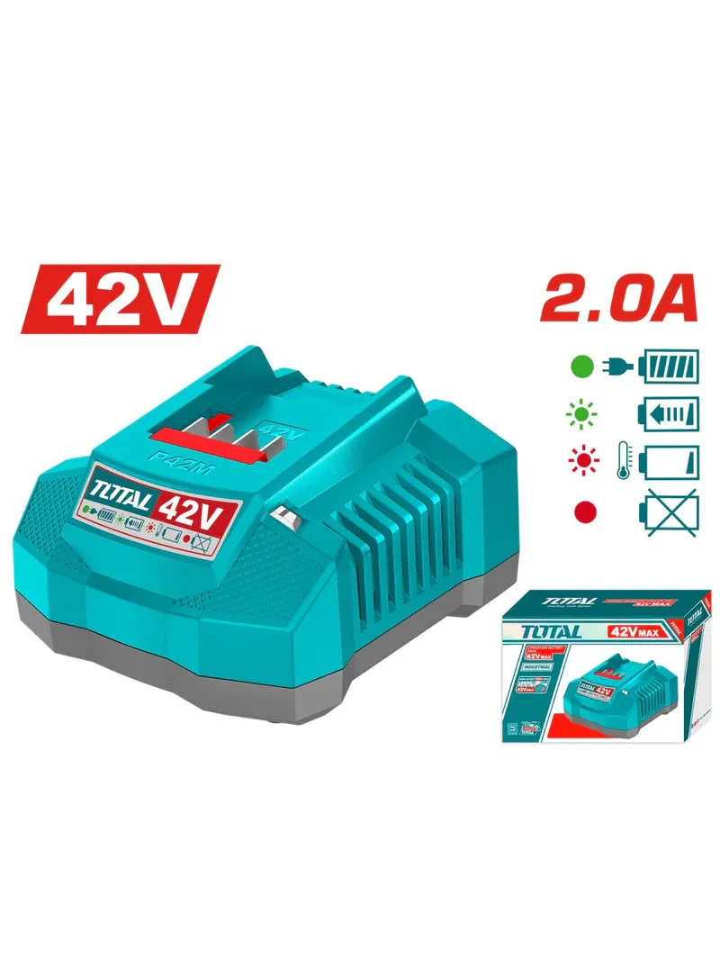 El cargador rápido Total Tools UTFCLI42021 de 42V 2.0A está diseñado para ofrecer una carga eficiente y segura de baterías de 42V. Cuenta con voltaje de entrada de 110–120V~50/60Hz, salida de 42V y corriente de 2A, proporcionando un rendimiento estable y confiable que reduce los tiempos de recarga y prolonga la vida útil de las baterías.