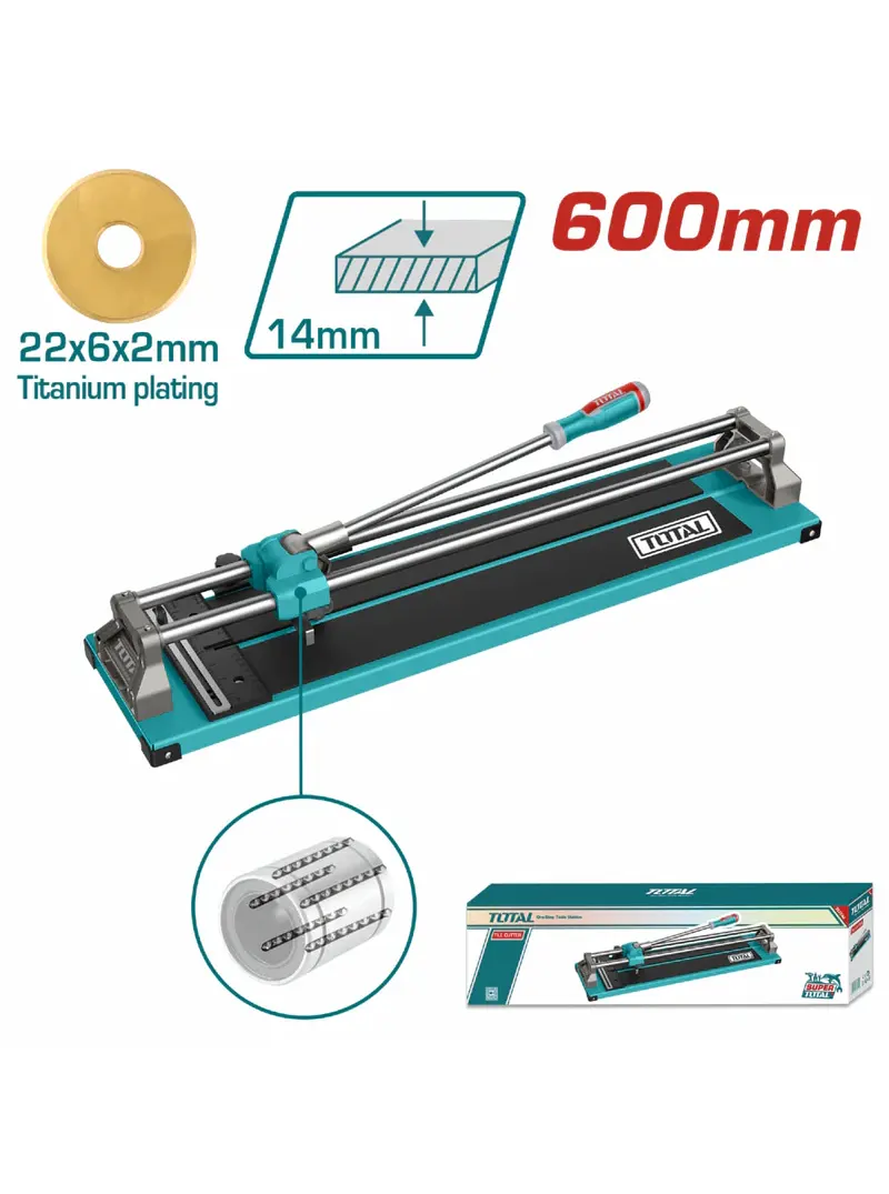 El cortabaldosa industrial 600 mm TOTAL TOOLS THT576002 está diseñado para cortes precisos y eficientes en azulejos, con capacidad máxima de corte de 600 mm y espesor de hasta 14 mm. Cuenta con base de acero de 820 x 200 mm, soportes de acero hueco y deslizadores de aluminio que garantizan estabilidad y suavidad en el corte. Permite cortes rectos y diagonales, incorpora barra deslizante de 20 mm para mayor firmeza y cuchilla de 22 x 6 x 2 mm, ofreciendo un desempeño confiable en trabajos profesionales.