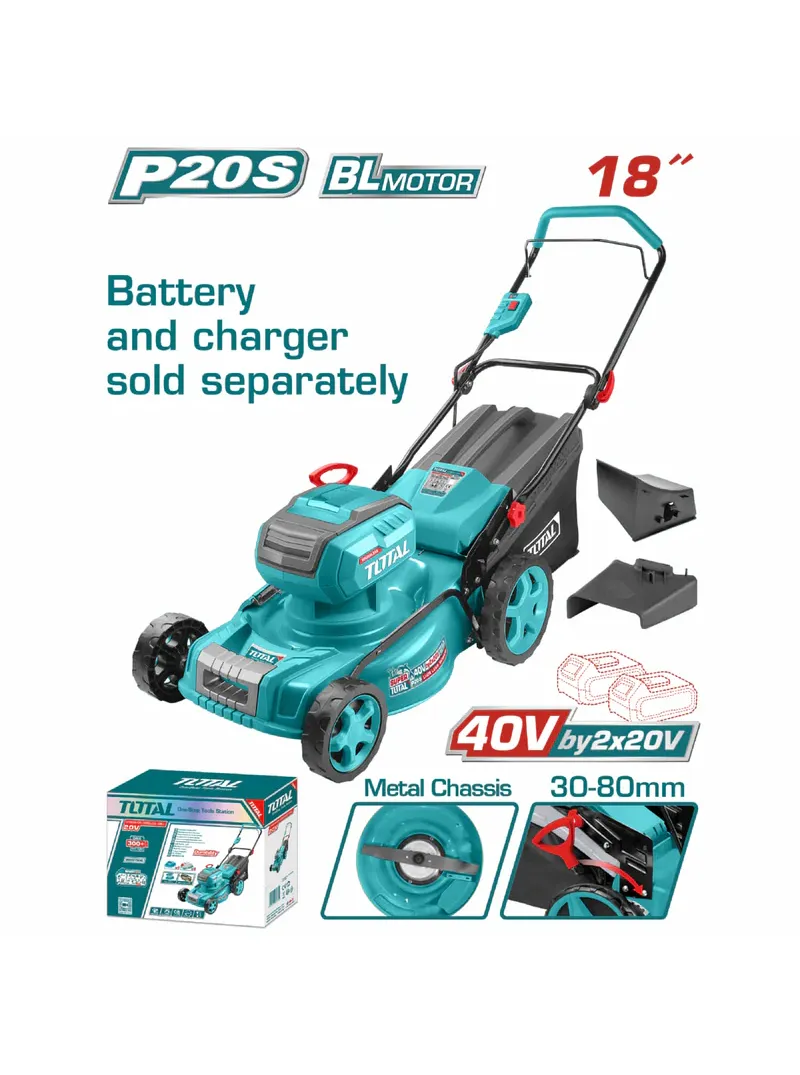 La cortadora de césped inalámbrica 18" TOTAL TLMLI20185 ofrece alto rendimiento con motor sin escobillas y sistema de 40V (20V+20V), alcanzando 2800 rpm para un corte eficiente. Cuenta con ancho de corte de 460 mm y bolsa recolectora de 60 L, además de ajuste de altura con palanca única. Incorpora 3 funciones: recolección, mulching y descarga lateral, brindando versatilidad para el mantenimiento del jardín (batería y cargador se venden por separado).