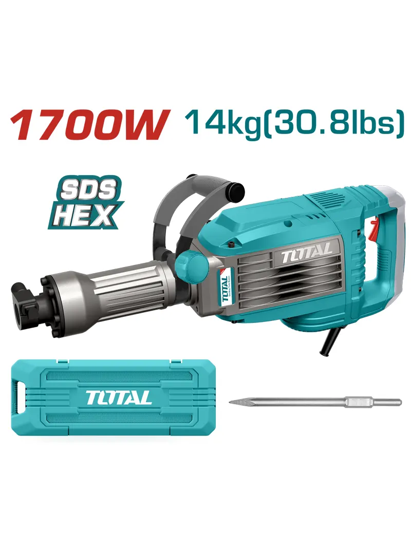 El Demoledor Hexagonal 1-3/16″ 50J TOTAL UTH217068 es un rompedor de alto desempeño para trabajos pesados de demolición. Funciona a 110–120V ~ 50/60Hz, con potencia de 1700W, tasa de impacto de 1900 bpm y energía de impacto de 50J, ofreciendo gran capacidad de remoción. Cuenta con sistema de portaherramienta HEX, peso aproximado de 30.8 lb e incluye paquete de cinceles, ideal para aplicaciones