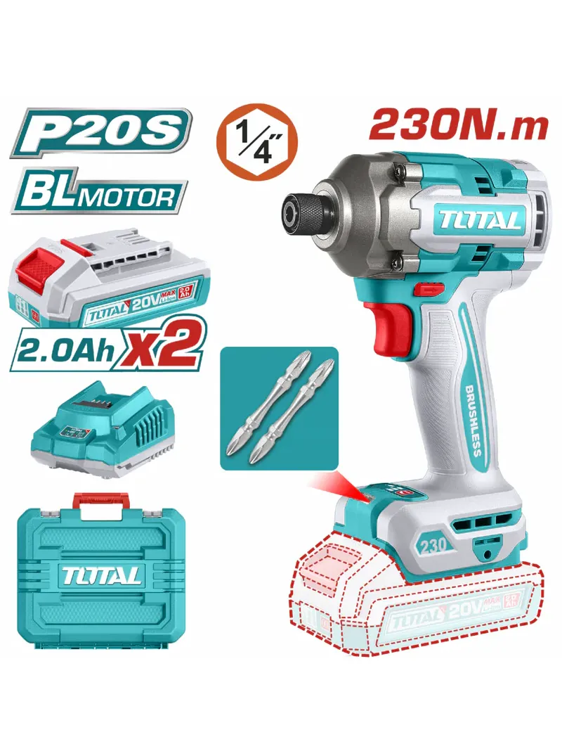 El Destornillador Inalámbrico de Impacto 1/4″ TOTAL UTIRLI2023 cuenta con motor sin escobillas, 20V y vástago hexagonal de 6.35 mm, ofreciendo 3 velocidades (0–2000 / 0–2400 / 0–2600 rpm) y par máximo de 230 Nm para aplicaciones exigentes. Incorpora luz LED de trabajo para mejor visibilidad. Incluye 2 puntas, 2 baterías de 2.0Ah y cargador 110–120V ~ 50/60Hz, listo para uso profesional.