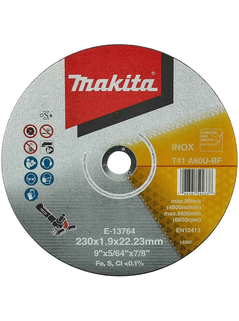 El Disco Abrasivo de Corte Inoxidable Tipo 1 9" x 2 mm Makita E-13764 está diseñado para corte rápido de acero inoxidable y metales. Con diámetro de 230 mm, espesor de 1.9 mm, orificio de 22.23 mm y grano A60U, su diseño delgado tipo 1 reduce el consumo de energía, ideal para amoladoras angulares inalámbricas, ofreciendo eficiencia, durabilidad y cortes precisos sin azufre.