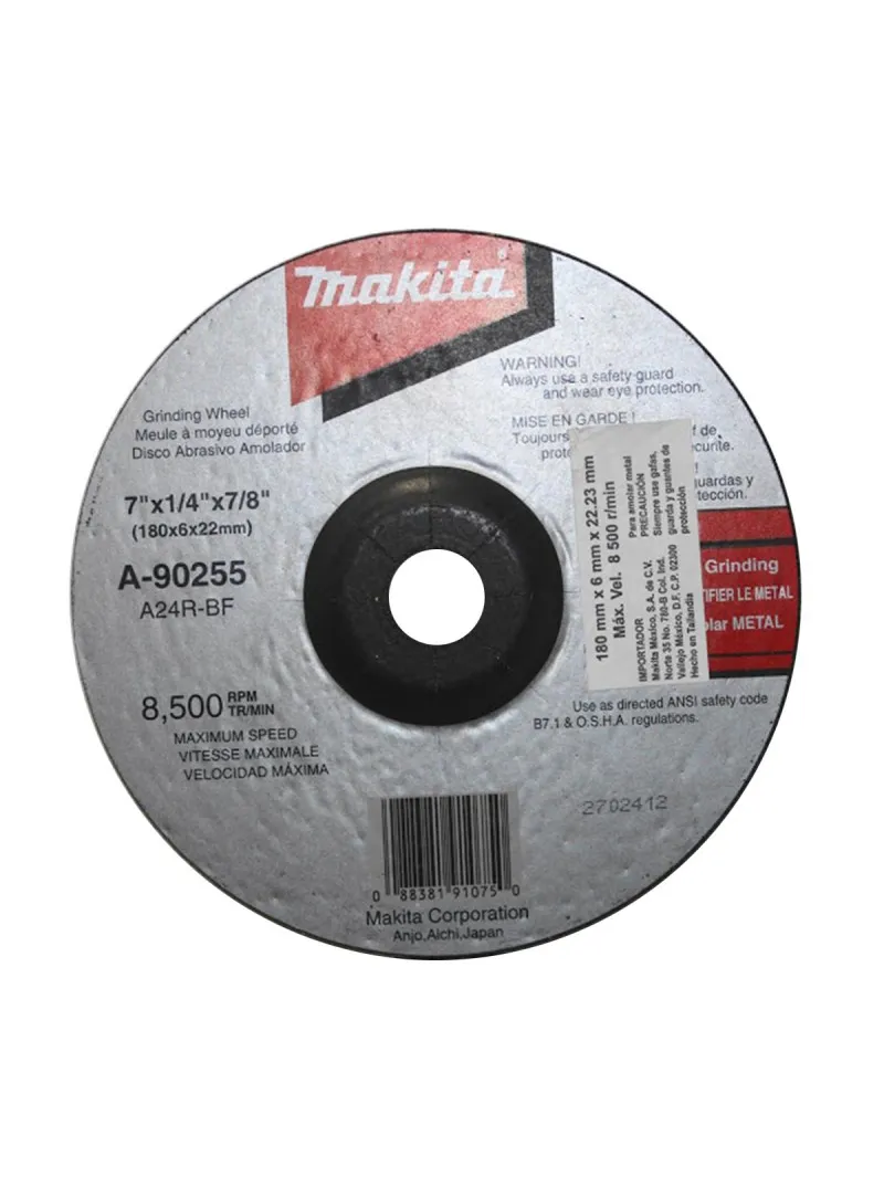 El Disco Abrasivo Tipo 27 7" x 1/4" Makita A-90255 está diseñado para operaciones de desbaste ligero a moderado en acero, fundición y soldadura. Fabricado con óxido de aluminio de alta calidad, ofrece buen acabado y velocidad de remoción, siendo ideal para trabajos de pulido y preparación de superficies.