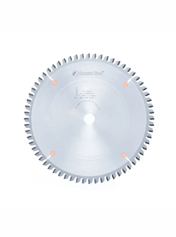 El disco para sierra circular de tungsteno para aluminio de 8" x 64 dientes 586401 de Amana Tool es ideal para cortar aluminio y materiales no ferrosos. Con su fórmula especial de carburo y geometría avanzada, asegura cortes precisos y acabados superiores, además de ser efectivo para materiales difíciles como plástico, tubos de PVC, fibra de vidrio y ACM