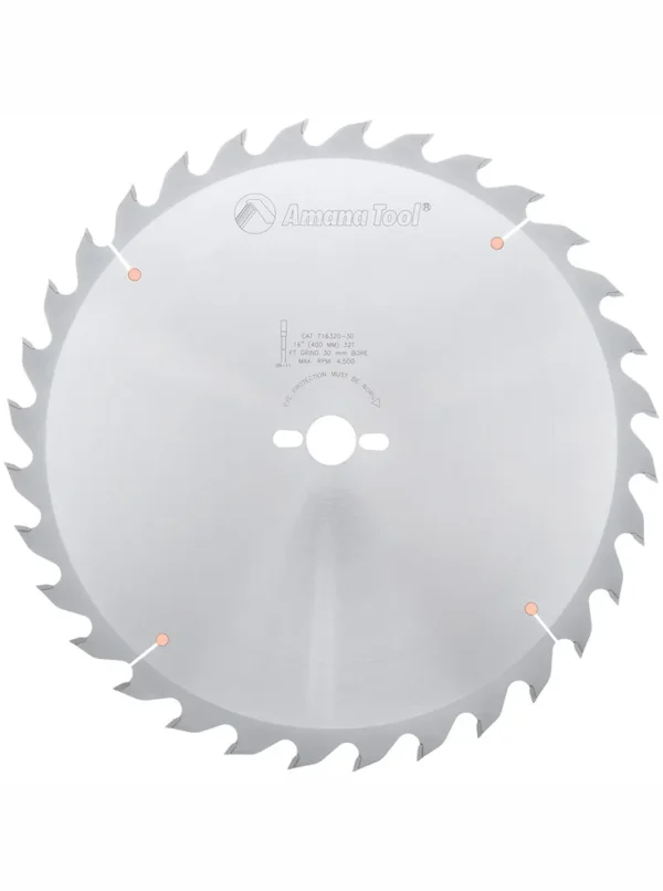 El disco para sierra circular de tungsteno para madera de 16" x 32 dientes 716320-30 de Amana Tool está especialmente diseñado para desgarro de alta producción. Con un bajo número de dientes, afilado de superficie plana y gargantas profundas, este disco ofrece una limpieza eficiente de virutas. Su placa gruesa reduce la vibración, asegurando cortes precisos y consistentes en operaciones con alimentadores mecánicos y desgarro en grupo. Es ideal para trabajar con madera dura y blanda en entornos de producción exigentes.