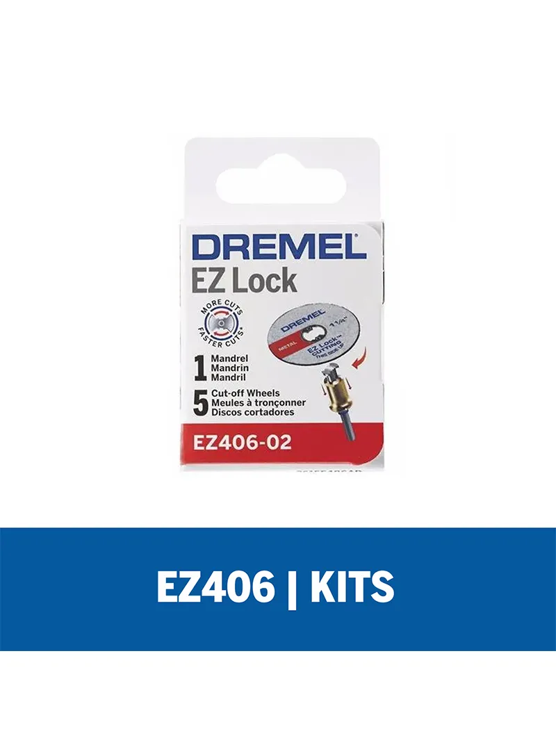 El Kit Dremel EZ406 convierte tu mototool en una potente herramienta de corte. Incluye el mandril EZ402 y 5 discos EZ456 de 38,1 mm reforzados con fibra de vidrio, ideales para cortar metal con eficiencia. Su sistema EZ Lock permite cambios rápidos y los discos ofrecen el doble de durabilidad comparados con el modelo 426.