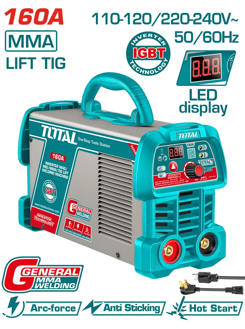 El equipo inversor de soldadura TOTAL UTW216059 de 160 A trabaja a 110/220 V con tecnología IGBT y ciclo de trabajo del 45%, ofreciendo corriente de salida hasta 160 A; cuenta con pantalla LED, función Lift TIG y voltaje en vacío de 85 V, e incluye portaelectrodos, pinza de tierra, cepillo de alambre, casco y cable de extensión, empacado en caja de color.