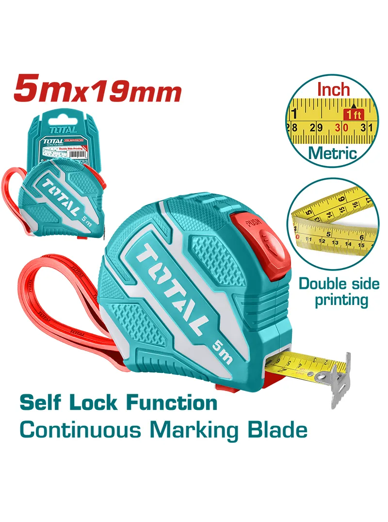 El flexómetro profesional TOTAL TMT126251 de 5 metros x 19 mm cuenta con cinta métrica de acero graduada en metros y pulgadas, doble botón de autobloqueo para mayor control y precisión, y carcasa con envoltorio de goma que mejora el agarre y la resistencia, ideal para trabajos profesionales de medición.