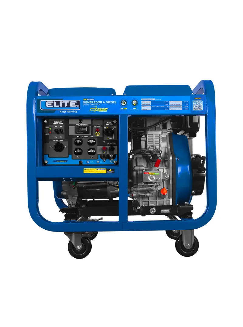 El generador planta diésel abierto Elite ED6512 ofrece una potencia de hasta 6,000 watts, equipado con motor de 4 tiempos de 10 HP y 3,600 rpm, ideal para suministrar energía confiable en aplicaciones profesionales con conexión 110/220V.