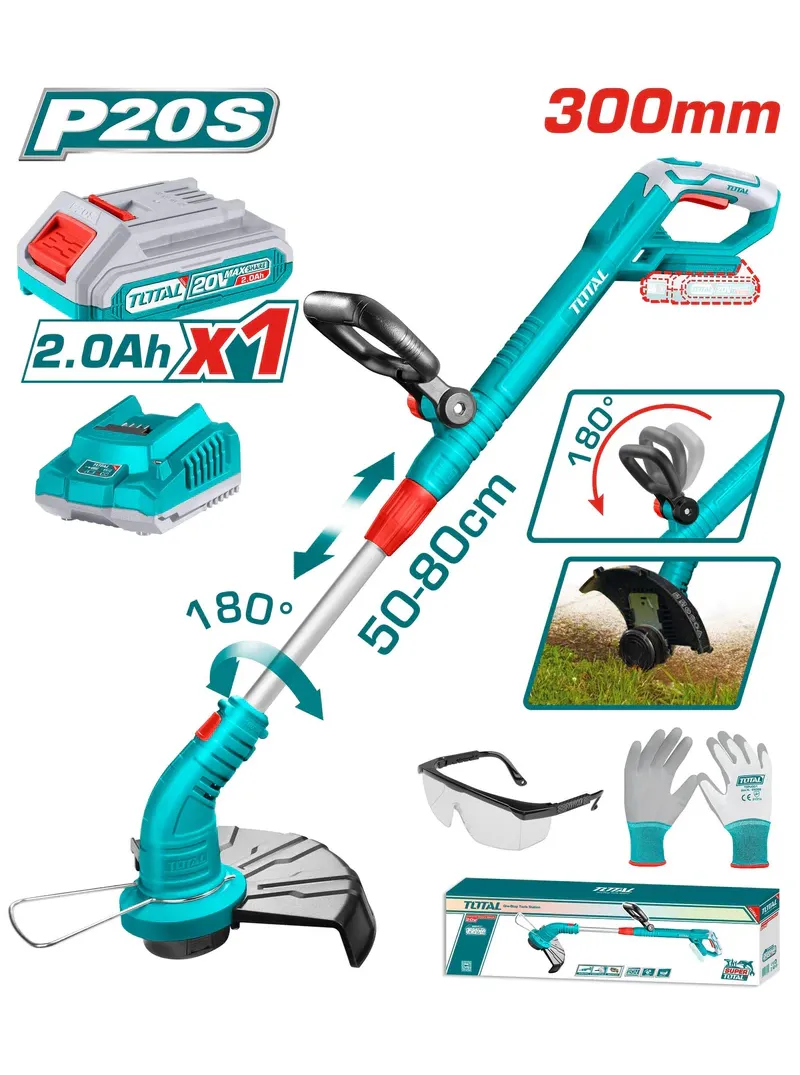 La Guadañadora Inalámbrica 20V TOTAL UTGTLI20301 ofrece 8200 rpm y diámetro de corte de 300 mm, ideal para mantenimiento de jardines y bordes. Utiliza línea retorcida de 1,6 mm con 5 m de longitud e incorpora función de borde para acabados más precisos. Incluye batería de 2.0 Ah, cargador 110–120V, gafas de seguridad y guantes recubiertos de PU, presentada en caja de color, lista para trabajar.