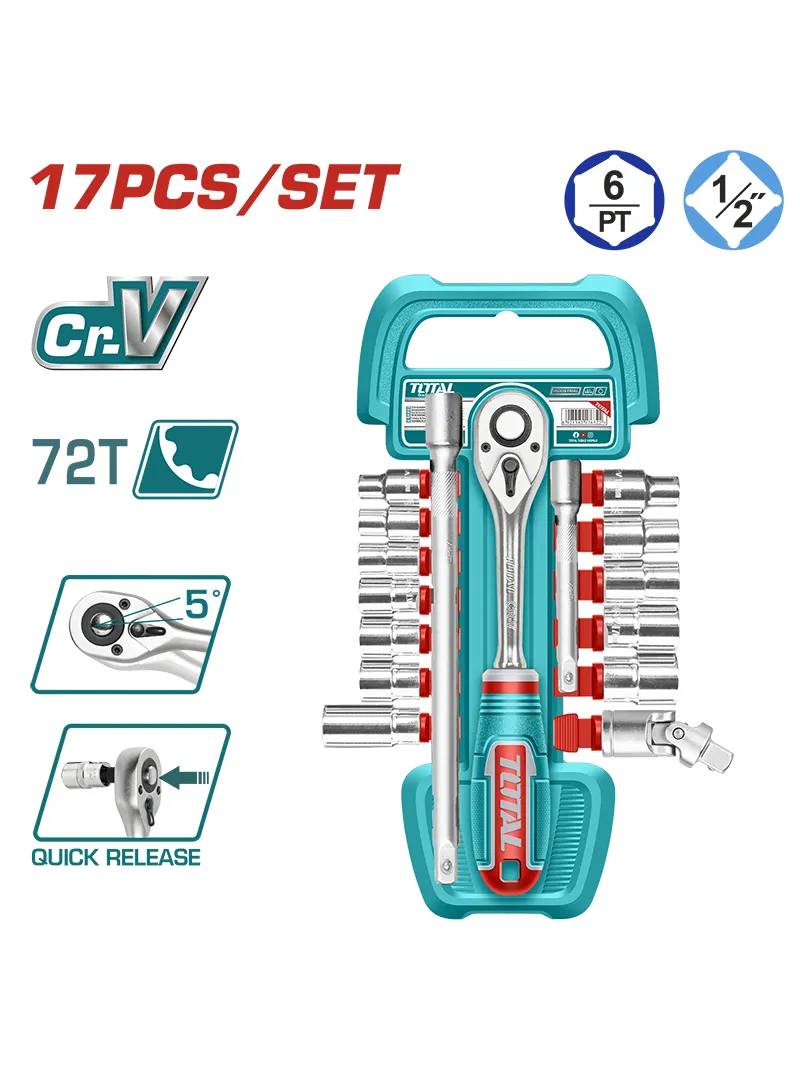 El juego de llaves copa y rachet TOTAL THT121171 de 17 piezas con encastre de 1/2" y medidas de 10 a 24 mm incluye copas, mango rachet de liberación rápida, barra de extensión, copa para bujía y junta universal, fabricado en acero Cr-V de alta calidad 50BV30, tratado térmicamente y con acabado cromado para mayor resistencia y durabilidad, empacado en colgador de plástico, ideal para trabajos mecánicos y de mantenimiento profesional.