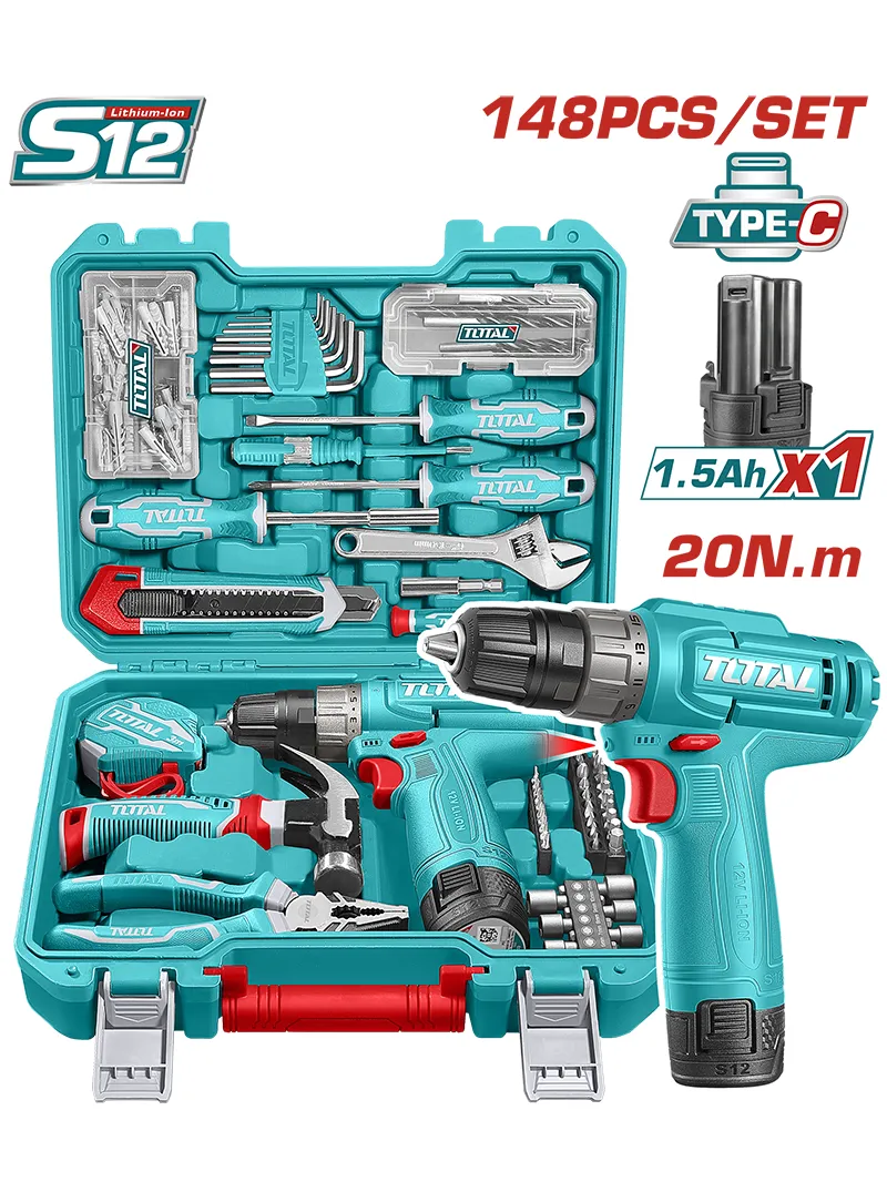 El kit de herramientas TOTAL de 148 piezas con taladro inalámbrico 12V es una solución completa para trabajos de mantenimiento y bricolaje. Incluye taladro con torque máximo de 20 Nm y mandril plástico, batería de 1.5 Ah con carga por USB Tipo-C, además de un amplio set con llaves, destornilladores, copas, puntas, flexómetro y más, ofreciendo versatilidad y practicidad en un solo equipo listo para usar.