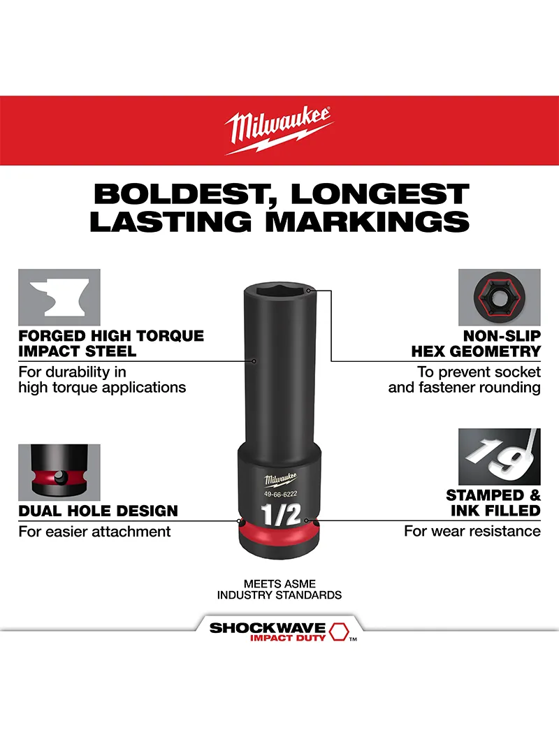 La llave de copa impacto larga Milwaukee 49-66-6223 de 1/2" x 9/16" forma parte de la línea SHOCKWAVE Impact Duty™, diseñada en acero forjado de alta resistencia para máxima durabilidad en aplicaciones de torque alto. Su geometría hexagonal antideslizante evita el redondeo del sujetador, mientras que las marcas de tamaño estampadas con tinta garantizan una identificación rápida y duradera. Incluye diseño de doble orificio y ranura anular para facilitar conexión y retiro, cumpliendo con normas ASME y respaldada por garantía de por vida.