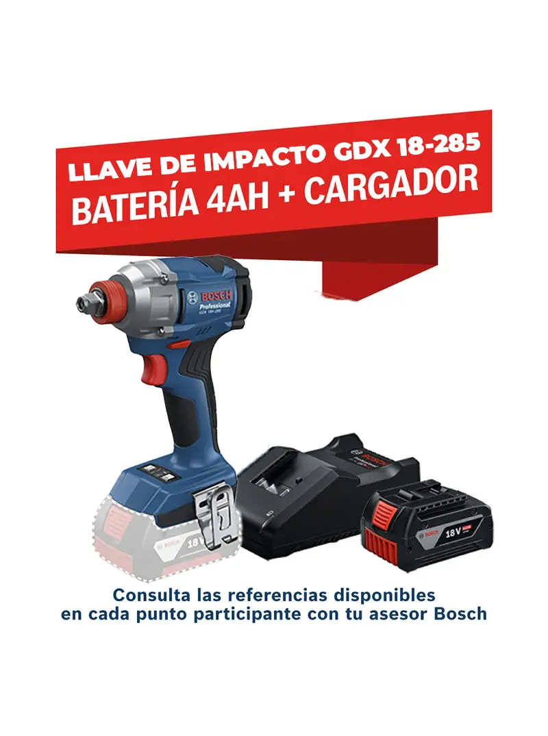 La llave de impacto Bosch GDX 18-285 combina potencia y versatilidad con su portaherramientas 2 en 1, que permite realizar trabajos de atornillado y fijación de pernos con una sola herramienta. Su motor ofrece un torque de 285 Nm y un selector de 2 velocidades, brindando alta productividad y precisión en tareas exigentes o delicadas. Su diseño ergonómico con empuñadura delgada y agarre suave garantiza comodidad incluso en usos prolongados. Incluye batería de 4.0Ah y cargador, ideal para aplicaciones profesionales que requieren potencia constante y control total.