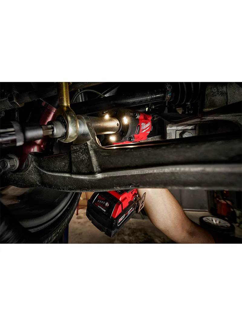 La llave de impacto inalámbrica Milwaukee M18 FUEL™ de 1/2″ con anillo de fricción es compacta (solo 4.9″ de largo) y potente, ofreciendo hasta 250 lb-pie de torque de arranque. Incorpora motor sin escobillas POWERSTATE™, sistema DRIVE CONTROL™ de 4 modos y función AUTO SHUT-OFF™ para evitar sobreaprietes. Sus 3 luces LED brindan máxima visibilidad y la electrónica REDLINK PLUS™ protege contra sobrecarga y sobrecalentamiento. El kit incluye 2 baterías M18 REDLITHIUM™ XC5.0 de alta duración y cargador.