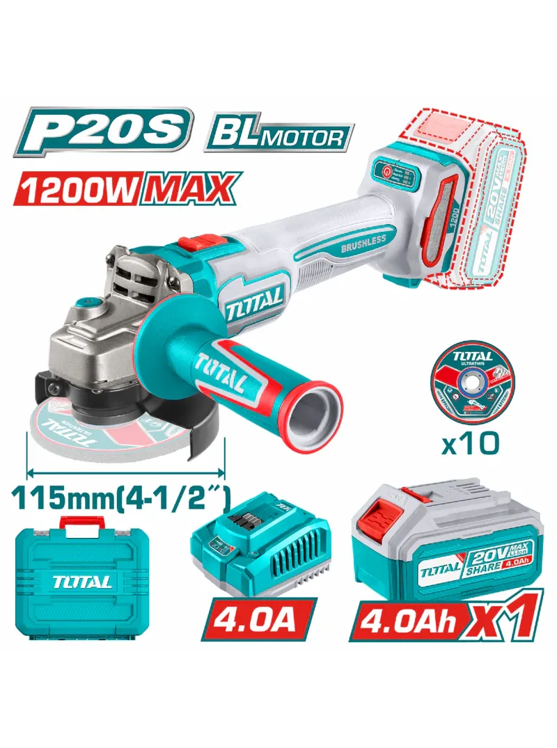 La mini pulidora inalámbrica 4-1/2" TOTAL UTAGLI2120252 ofrece alto rendimiento con motor sin escobillas y potencia de hasta 1200 W, alcanzando velocidades de 3000/6000/9000 rpm para adaptarse a مختلف aplicaciones. Cuenta con disco de 4-1/2" y rosca 5/8"-11UNC, ideal para corte y desbaste de metal. Incluye 10 discos abrasivos, batería de 4.0 Ah, cargador y estuche de transporte, brindando una solución práctica, potente y portátil para uso profesional.