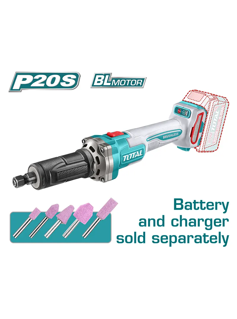 El Mototool Inalámbrico Largo 10.000–30.000 RPM TOTAL TDGLI2001 cuenta con motor sin escobillas y 20V, ofreciendo 3 niveles de velocidad (10.000 / 20.000 / 30.000 rpm) para trabajos de precisión, desbaste y acabado. Incorpora pinza de 6 mm (1/4″) e incluye 5 puntas montadas. No incluye batería ni cargador, ideal para usuarios de la plataforma 20V TOTAL.