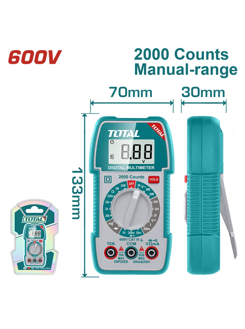 El multímetro digital TOTAL TMT5360011 AC/DC 600 V ofrece mediciones confiables con pantalla TRUE RMS de 2000 conteos, capacidad para medir voltaje CA/CC y corriente CC/CA, detección de voltaje sin contacto con distinción entre línea activa y neutra, prueba de diodo y funciones Max/Min y retención de datos; incorpora luz de fondo, linterna, indicadores de batería baja y LED en el conector de entrada, e incluye 3 baterías AAA, presentado en doble blíster para uso profesional.