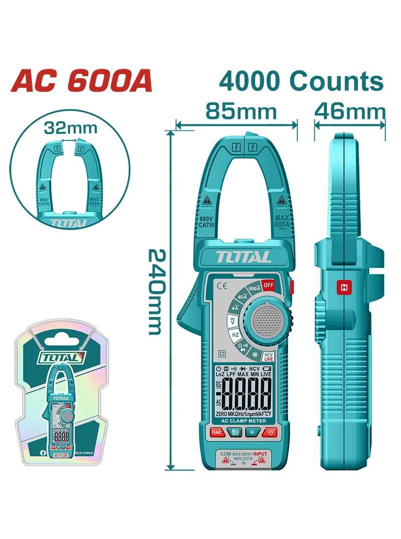 El multímetro pinza voltiamperimétrico TOTAL TMT766001 600 A ofrece mediciones precisas con pantalla TRUE RMS de 4000 cuentas, capacidad para medir corriente AC y voltaje DC/AC, retención de datos y linterna integrada; incorpora detección de voltaje sin contacto (NCV), prueba de diodo, indicador de batería baja y apagado automático, e incluye 3 pilas AAA, presentado en blíster doble para uso profesional.
