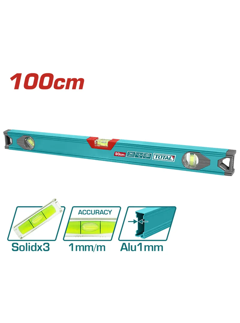 El nivel de aluminio económico TOTAL TMT210016 de 40” (100 cm) cuenta con estructura de aluminio liviano y resistente a la corrosión, ofreciendo alta precisión para trabajos de construcción y reparación; incorpora 3 gotas de burbuja para mediciones horizontales, verticales y angulares, además de almohadillas de goma que mejoran la estabilidad sobre superficies lisas, garantizando un uso práctico, confiable y eficiente en tareas de nivelación.