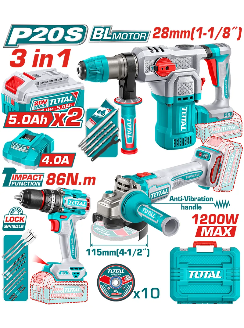 El combo TOTAL UTOSLI251195 integra pulidora, rotomartillo SDS Plus 1.1/8" y taladro percutor 1/2", todos inalámbricos de 20V con motor sin escobillas para mayor eficiencia y durabilidad. La pulidora ofrece hasta 1200 W con disco de 115 mm y mango antivibración, el taladro alcanza un torque de 86 Nm con portabrocas metálico y el rotomartillo entrega 4,5 J de impacto para perforaciones exigentes en mampostería. Incluye 2 baterías de 5 Ah, cargador, brocas para madera, concreto y metal, puntas de impacto, discos abrasivos y maletín, brindando una solución completa y profesional lista para trabajar.