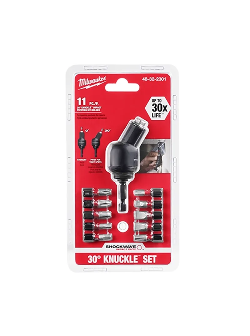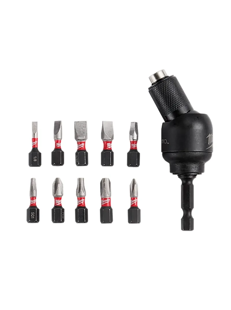 El portapuntas articulado 1/4" Milwaukee 48-32-2301 permite trabajar en ángulos de 0° y 30° en espacios estrechos, usando accesorios hexagonales SHOCKWAVE™ Impact Duty™. Soporta hasta 2,000 pulg.-lb de torque y ofrece durabilidad extrema con tecnología SHOCKWAVE™, que prolonga la vida útil hasta 30 veces. Incluye 10 brocas de inserción SHOCKWAVE™ tratadas con calor para máxima resistencia y rendimiento.