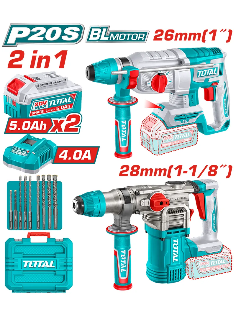 El combo de rotomartillos inalámbricos TOTAL UTOSLI250462 incluye los modelos TRHLI20288 de 1” y TRHLI20268 de 1-1/8”, ambos de 20V, ofreciendo alto rendimiento para perforación en concreto, madera y acero; combina una energía de impacto de hasta 4.5 J y velocidades de hasta 5000 impactos por minuto, brindando potencia, versatilidad y movilidad gracias a su tecnología inalámbrica, con diseño ergonómico ideal para trabajos profesionales de construcción, remodelación y mantenimiento.
