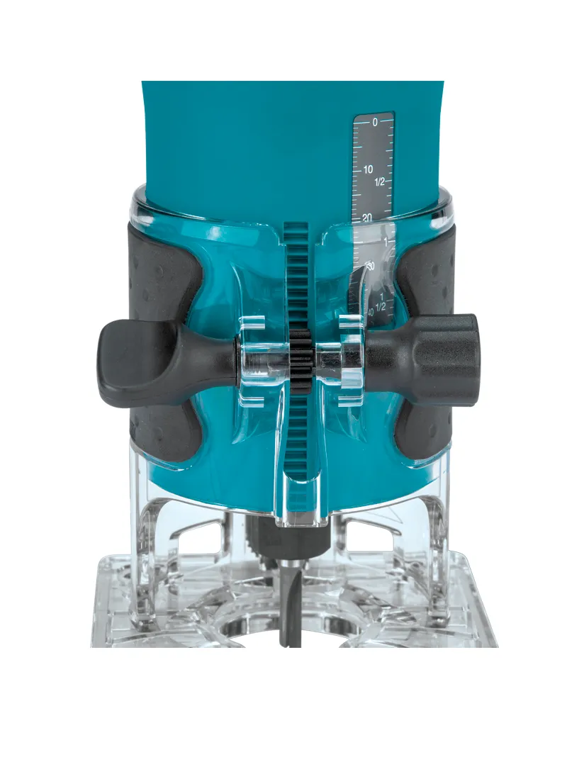 La Ruteadora Refiladora 560W Espigo 1/4" Makita 3709 ofrece ajuste de profundidad suave y preciso mediante su mecanismo de sujeción, empuñadura con recubrimiento de neopreno para mayor confort y control y base de plástico transparente que permite una visión clara de la orilla de corte, siendo ideal para trabajos de perfilado y acabados precisos en carpintería.
