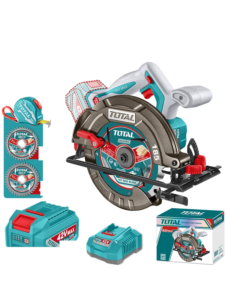 La sierra inalámbrica circular de mano TOTAL UTSLI4218511 de 7-1/4” cuenta con motor sin escobillas y velocidad de 4800 rpm, ofreciendo cortes precisos con profundidad ajustable y bisel regulable; permite una capacidad de corte de 45 mm a 45° y 65 mm a 90°, e incluye 2 hojas de 185 mm, batería de 2.5 Ah, cargador y cinta métrica, empacada en caja a color.