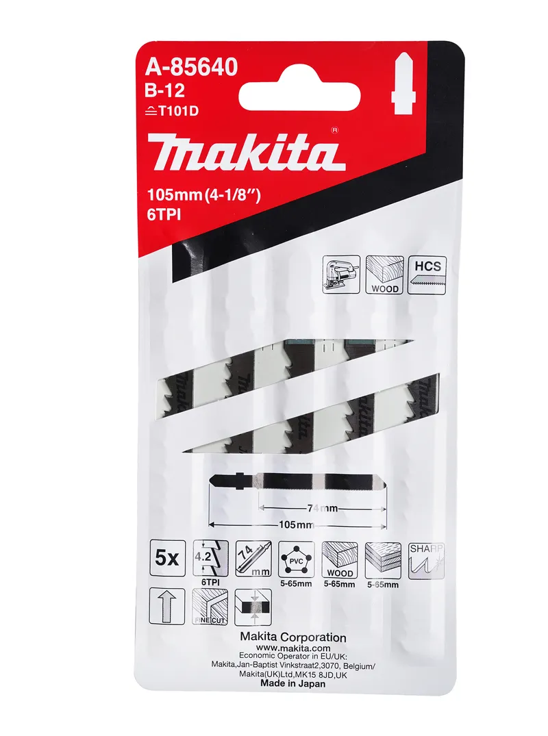 El set de sierras para caladora Makita A-85640 incluye 5 hojas de alta precisión diseñadas para realizar cortes limpios, controlados y eficientes en distintos tipos de madera. Fabricadas en acero de alta resistencia (HCS), ofrecen una durabilidad superior y un rendimiento constante incluso en condiciones de trabajo exigentes.Cada hoja cuenta con un diseño optimizado de dientes finos y afilados que garantiza cortes uniformes, sin astillado, y una excelente estabilidad durante la operación. Son compatibles con caladoras universales, lo que permite un montaje rápido, seguro y una amplia versatilidad de uso.Este set es ideal para carpintería, ebanistería, montaje de mobiliario y trabajos de precisión en madera y MDF, brindando eficiencia, confiabilidad y acabados profesionales.