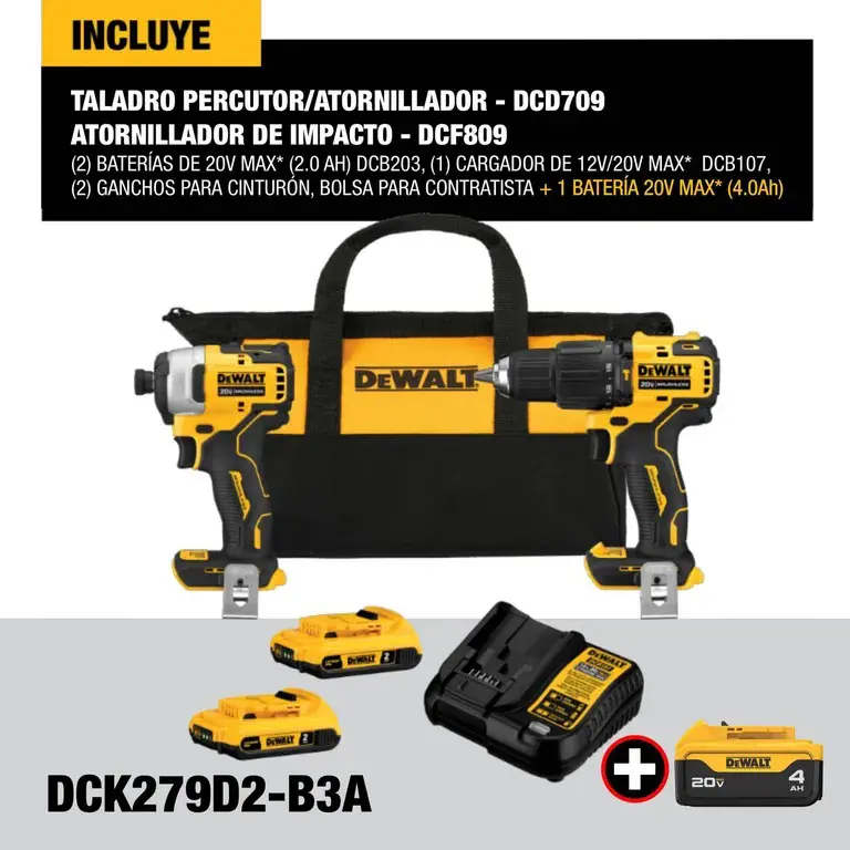 | Incluye | | (1) DCD709 20V 1/2″ Taladro percutor | (1) DCF809 20V 0,63 cm atornillador | (2) Clip de cinturón | (1) Cargador DCB107 | (1) Batería de iones de litio de 20V Max 4 Ah | (2) Baterías de iones de litio de 20V máximo | Bolsa |