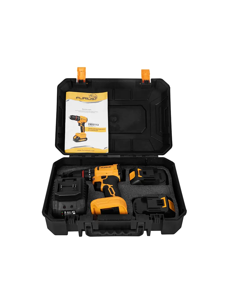 El Taladro Inalámbrico Percutor 21V 1/2" + 2 Baterías FURIUS FBD2150K cuenta con motor brushless que ofrece mayor eficiencia y vida útil. Incorpora mandril metálico de 1/2″ (13 mm), torque máximo de 45 Nm y dos velocidades, ideal para perforación, atornillado y rotopercusión en madera, drywall, ladrillo y metal, brindando versatilidad para trabajos de mantenimiento y montaje.