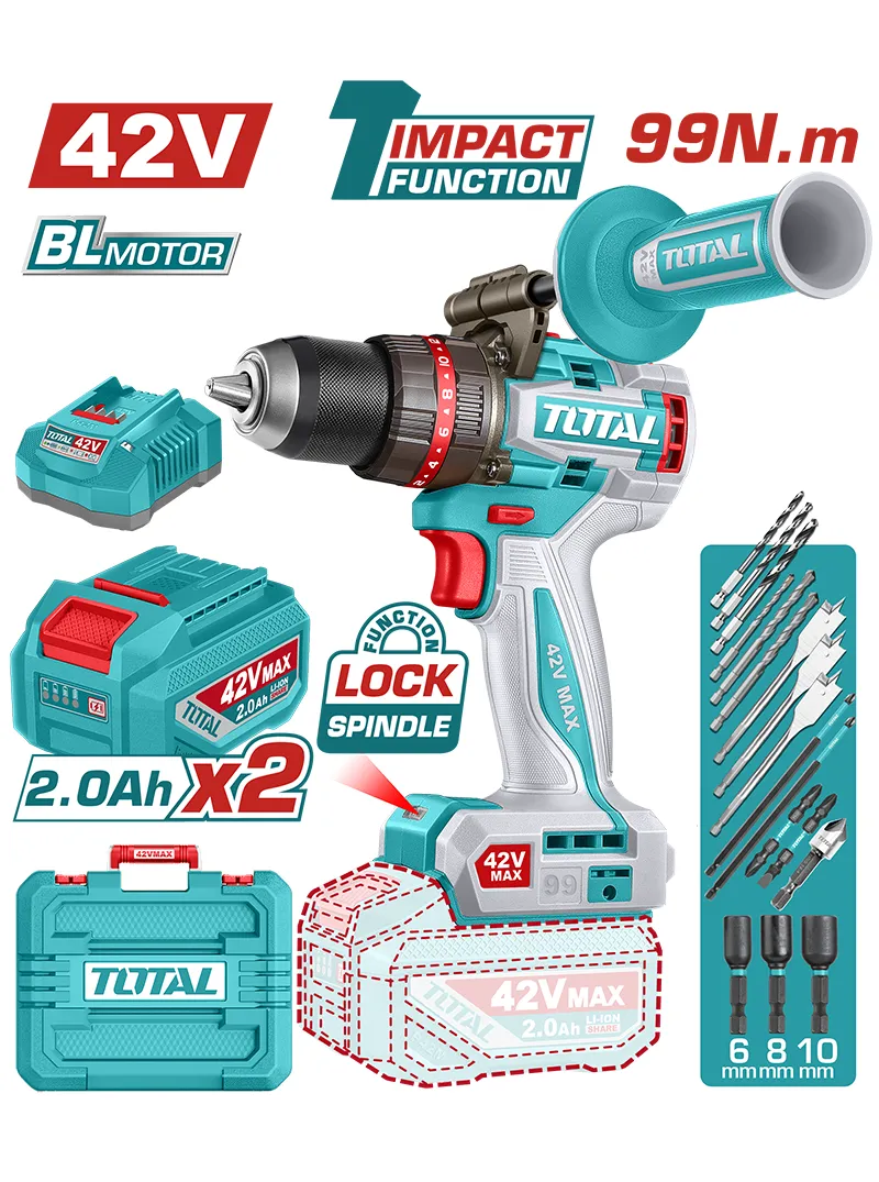 El taladro inalámbrico percutor TOTAL UTIDLI429982 ofrece alto desempeño para trabajos exigentes gracias a su motor sin escobillas y voltaje de 42V, alcanzando una velocidad sin carga de 0–500 / 0–2000 rpm y un potente torque máximo de 99 Nm. Incorpora mandril metálico de 1/2” para mayor resistencia y sujeción segura, e incluye 2 baterías para mayor autonomía, además de puntas, convirtiéndolo en una herramienta robusta, potente y confiable para uso profesional.